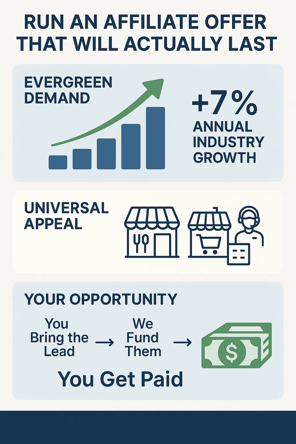 Ditch the short-lived campaigns that fizzle out fast. Push an EVERGREEN product that businesses of ALL sizes need, in a massive industry growing over 7% every year.